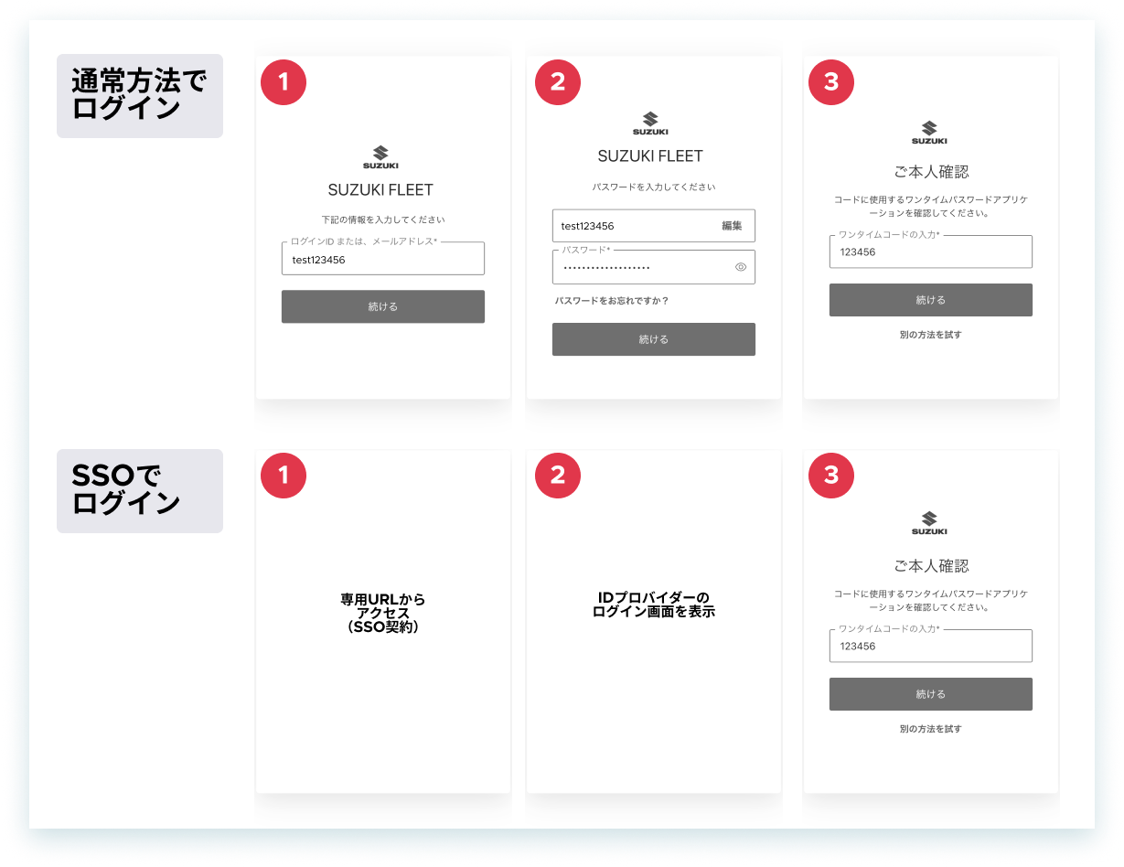 - SSOを契約しているとき:①SSO情報を入力+②MFA